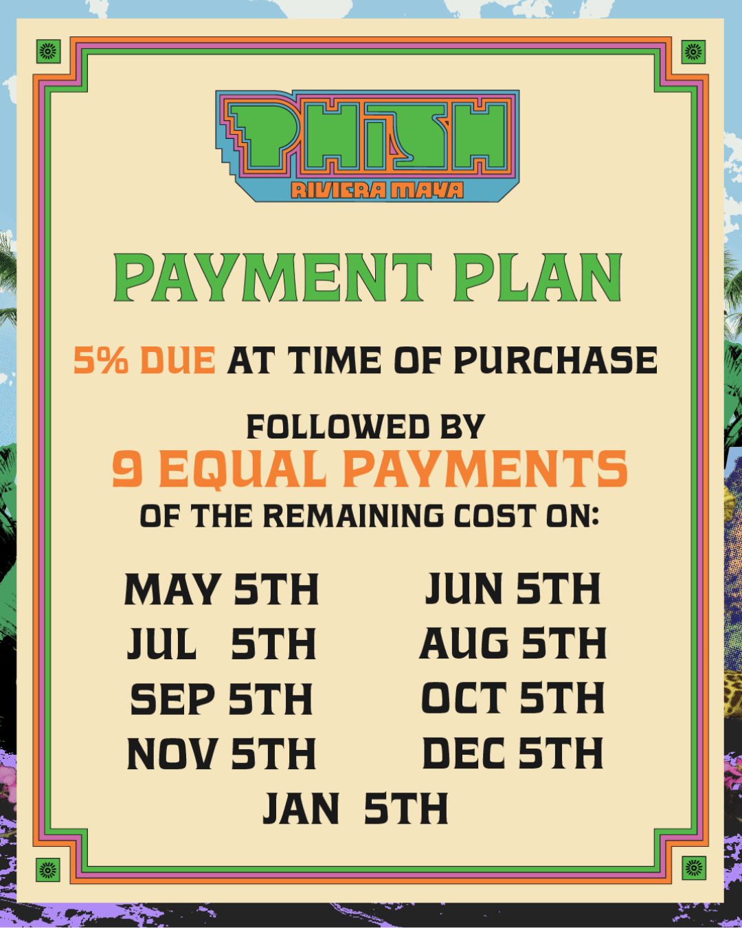 A payment plan is available for all packages! Break up the cost of your Phish: Riviera Maya package into 9 monthly installments following an initial deposit.